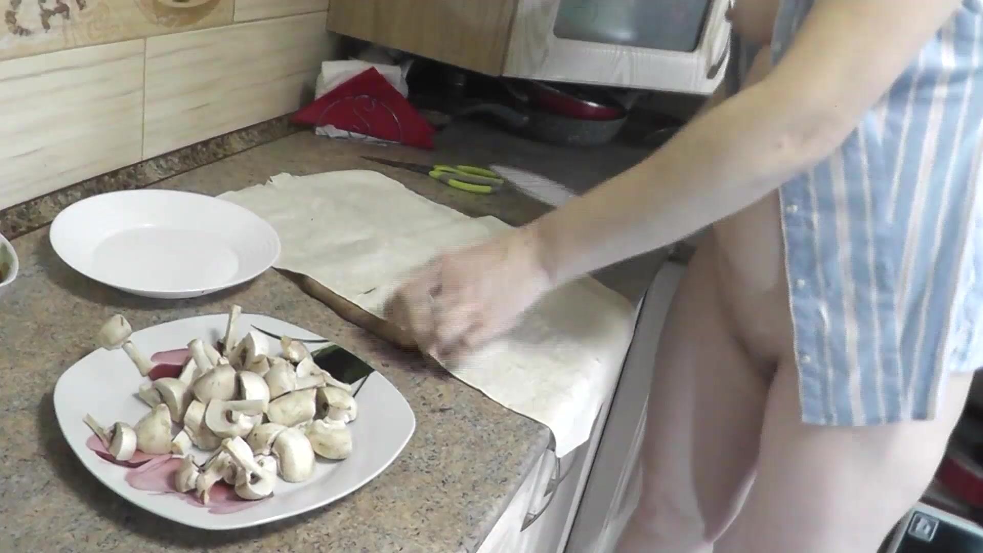 SEXY MOMMY MILF FRINA CONTINUES HER NUDE COOKING. WITHOUT PANTIES AND BRA HIGH HEELS IN KITCHEN MILF PREPARES DELICIOUS VEGETARIAN APPETIZER OF PITA BREAD AND CHAMPIGNONS WITH SAUCE. PUSSY ASS BIG NATURAL TITS MILF