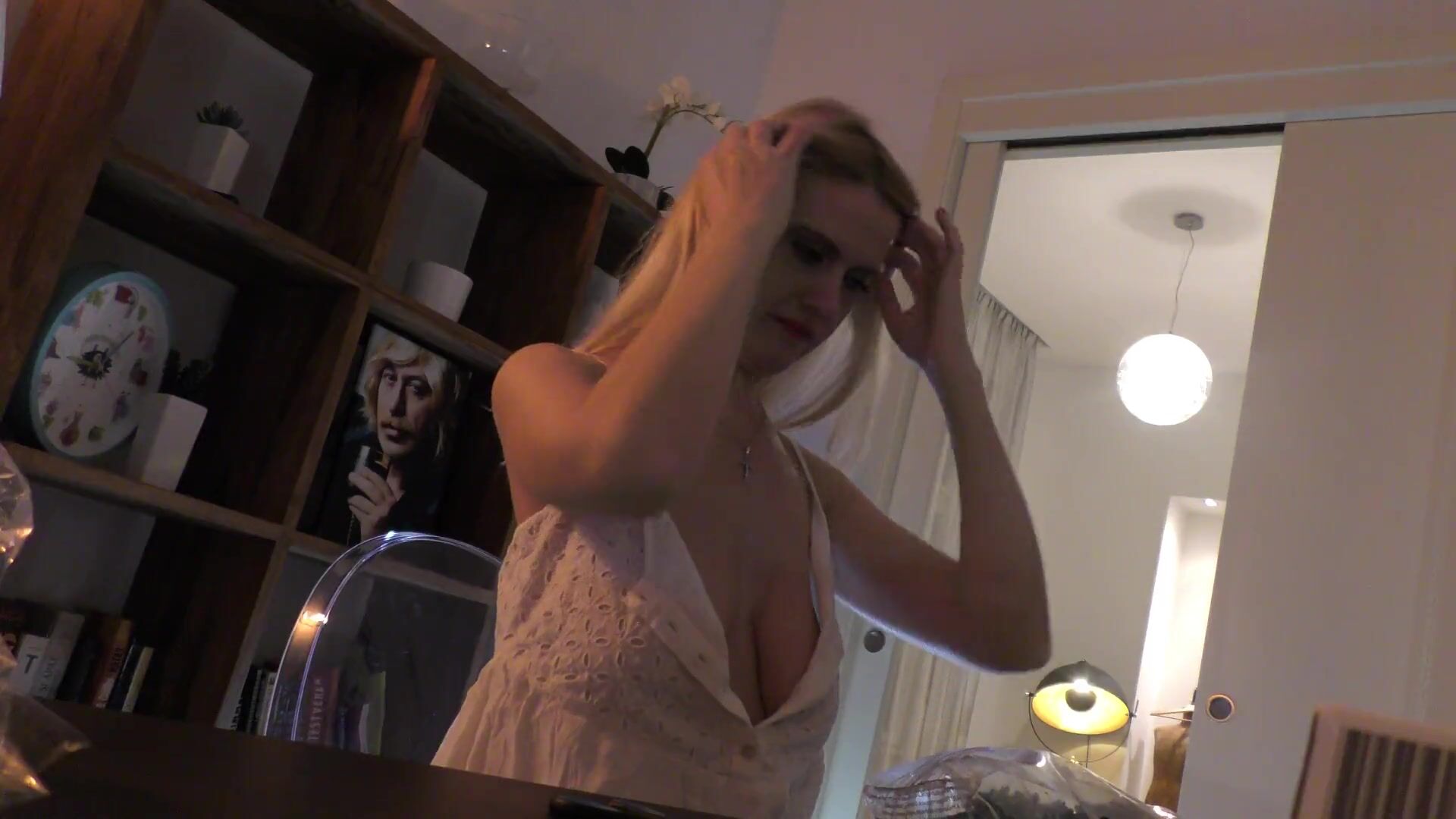 ALL NATURAL WONDERFULLY BEAUTIFUL BIG BOOBS BLONDE WIFE IN SEXY WHITE SUMMER DRESS TEASES TO SEDUCE