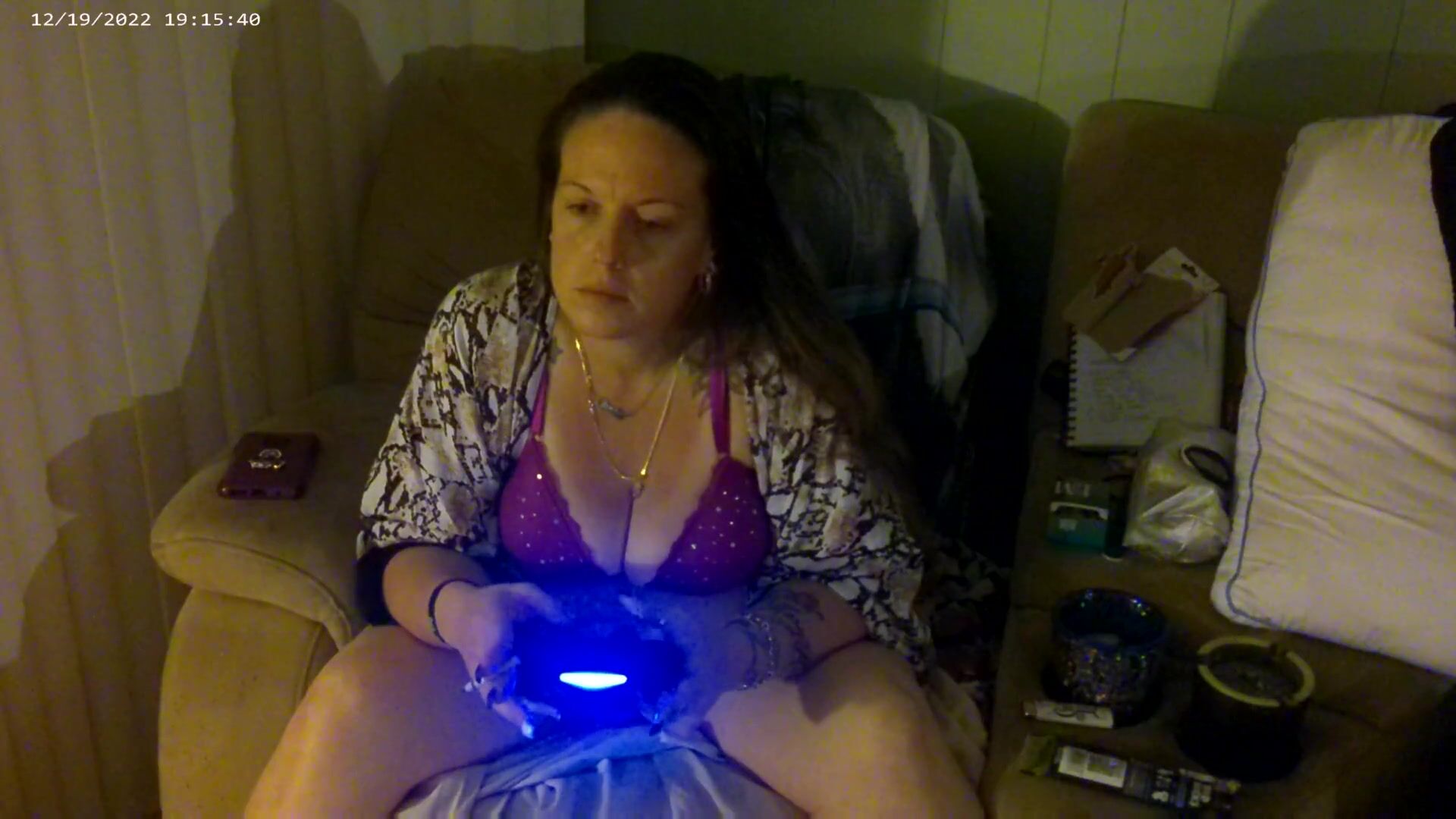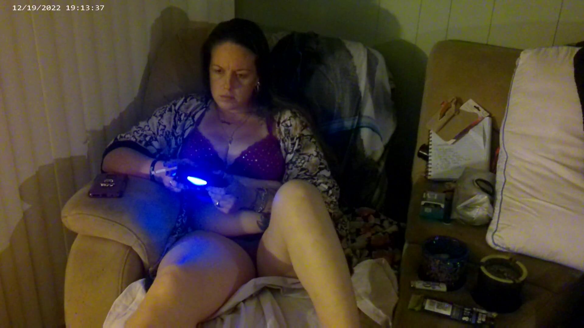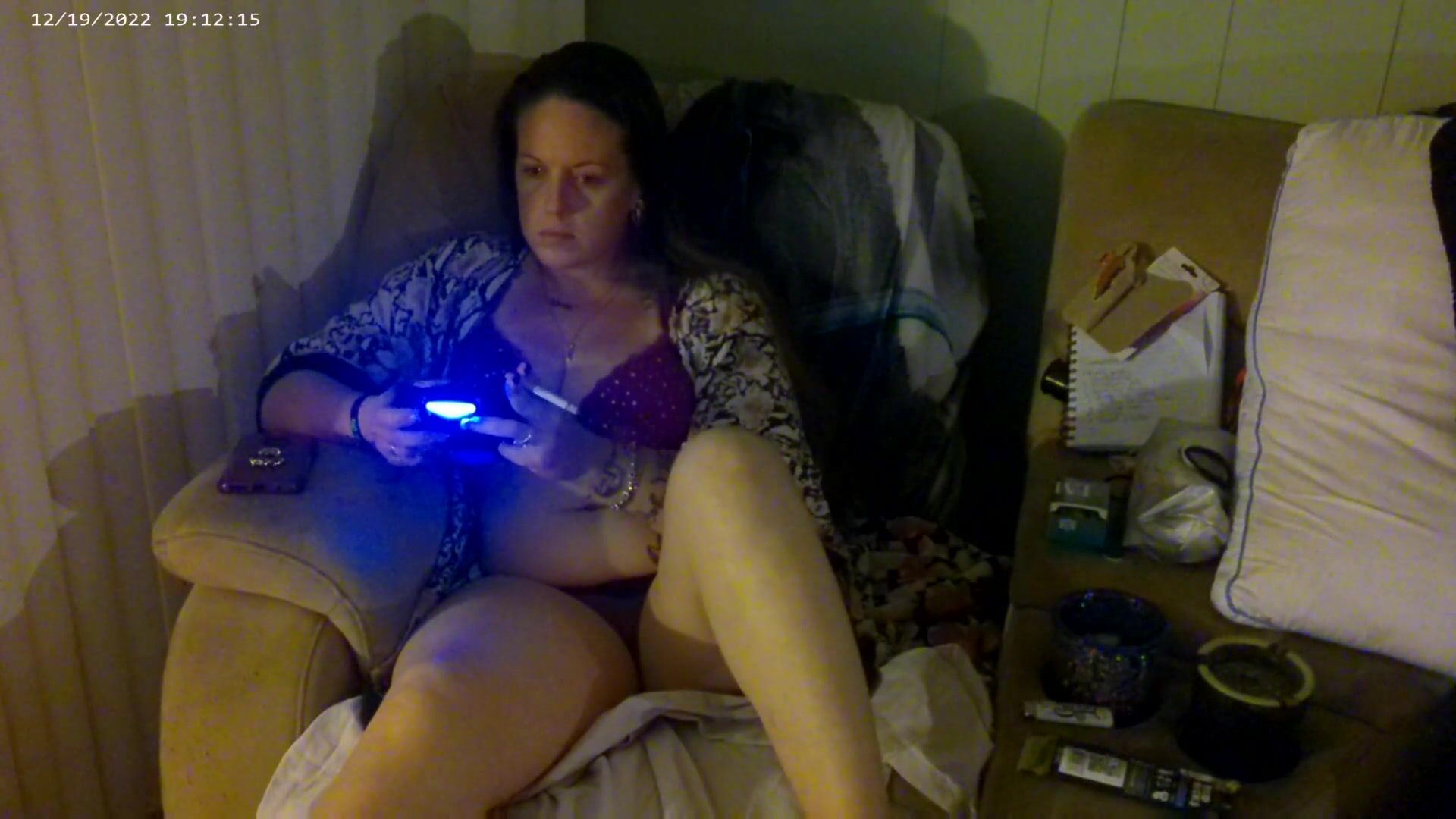 BUSTY LONG HAIR GAMER GIRL IN BRA AND PANTIES PLAYING SMOKING CIGARETTES PART 2