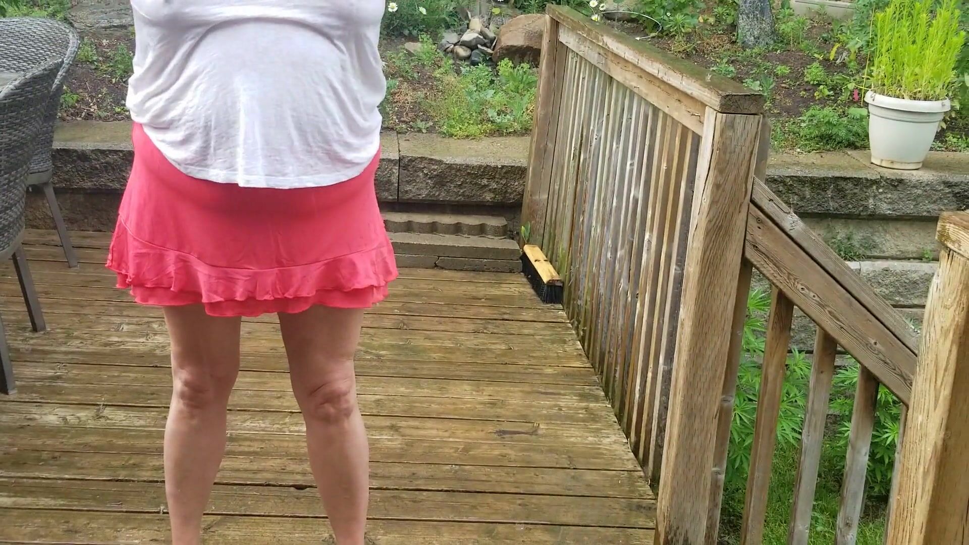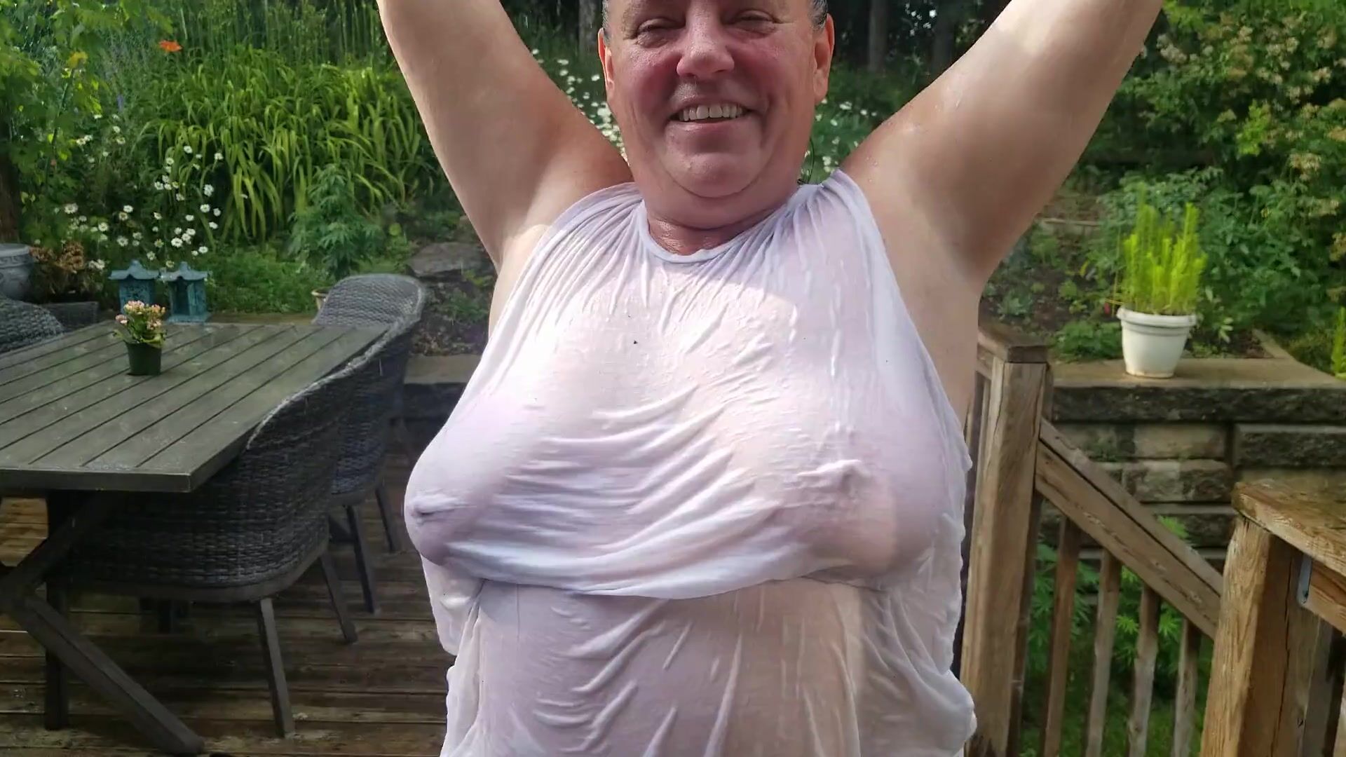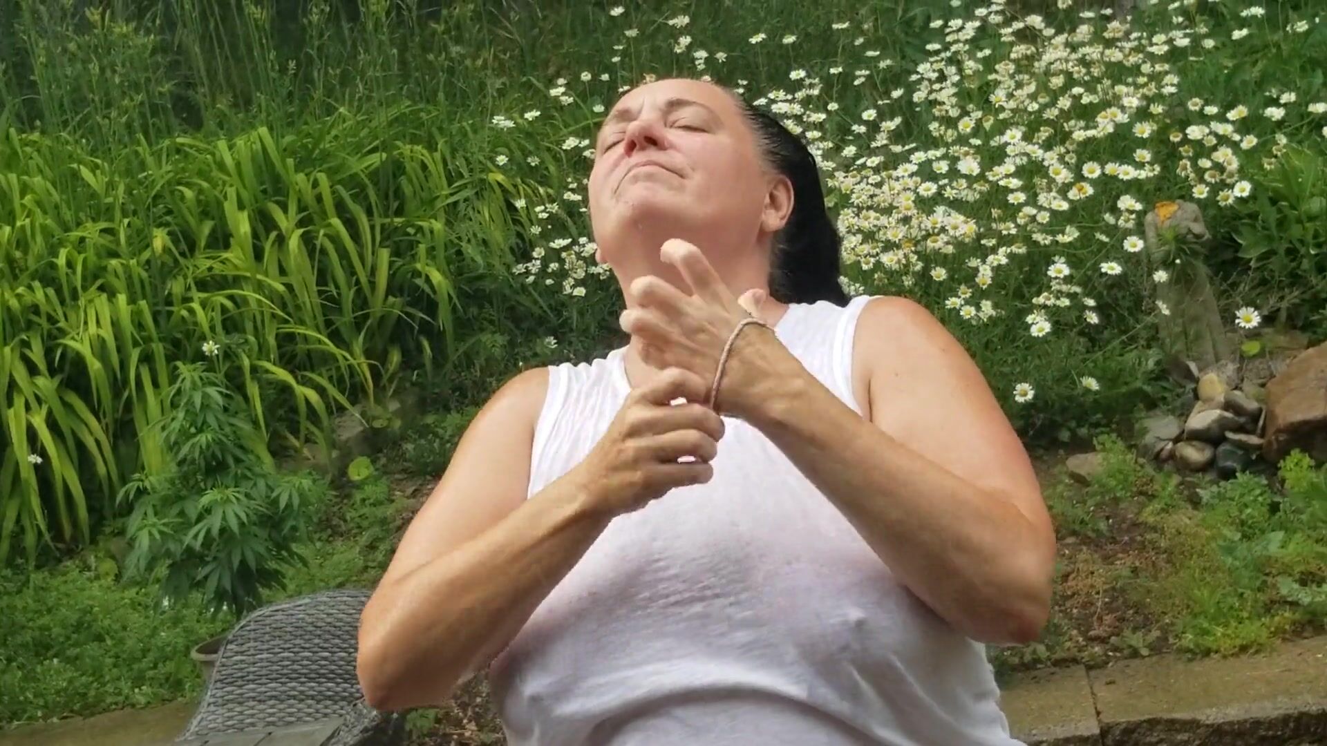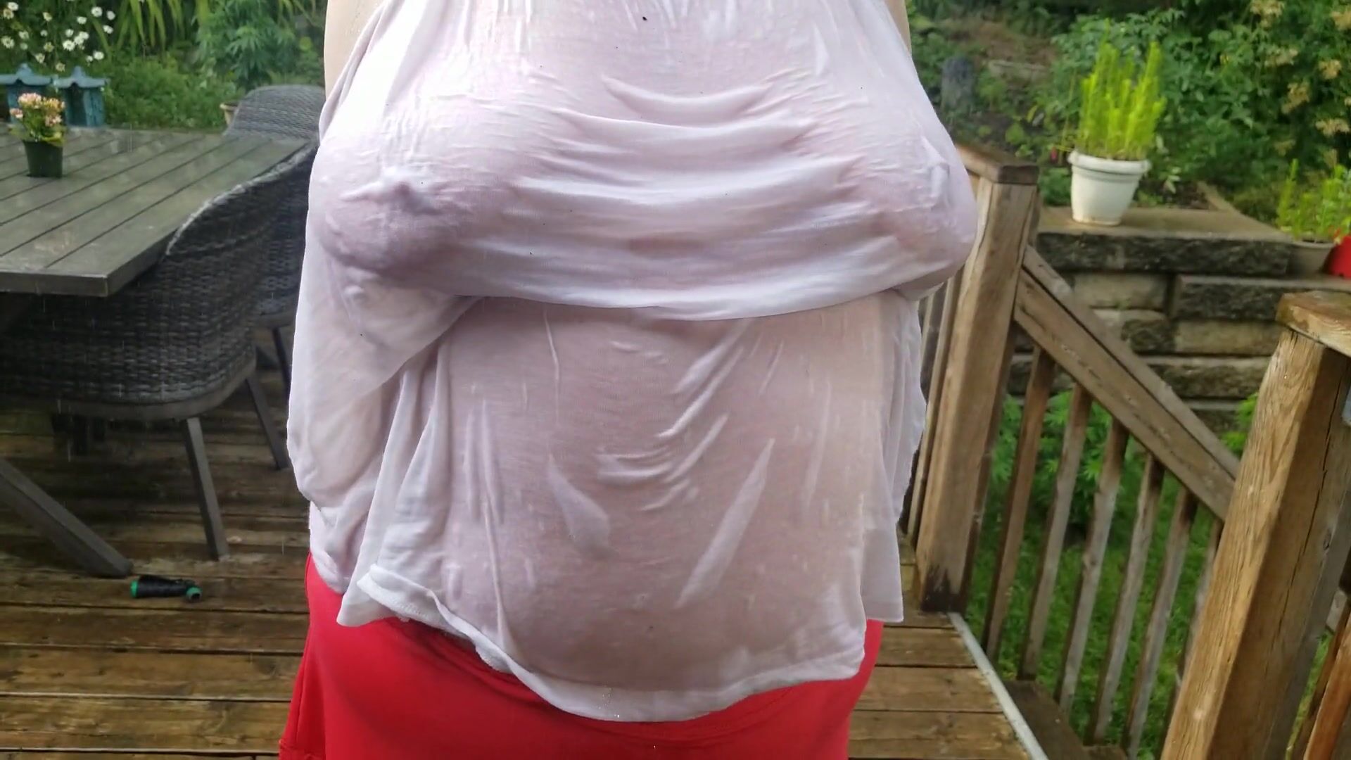 TARABLEE HOTZ- COOLING OFF IN THE RAIN ON A HOT DAY. MY WET T-SHIRT BARELY CONCEALS MY BIG TITS.